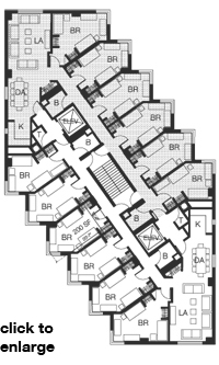 allowed each apartment to have its own elevator entry. Maximum wall area was obtained by placing the