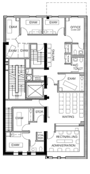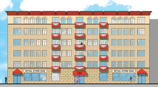 A new 6-story building wraps around and over an existing 4-story structure that could not be demolished due to a property covenant. The newer portion is celebrated by projecting forward to the property line and has doors that open to glass panel railings. The building contains four residential levels over two Medical Office floors, requiring the removal of the floor/roof structure and new window placements. The offices have a therapy pool and a car elevator to service the garage.